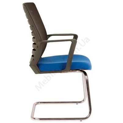 Офісний стілець з дихаючою спинкою, пластиковими чорними підлокітниками, на хромованих полоззях.