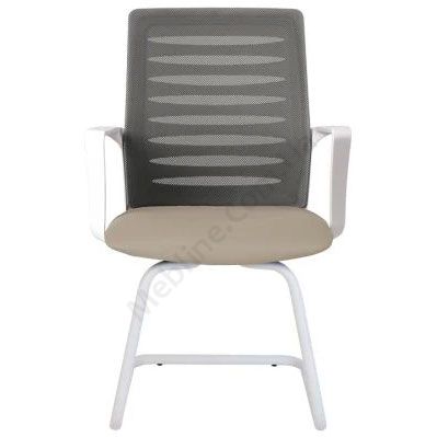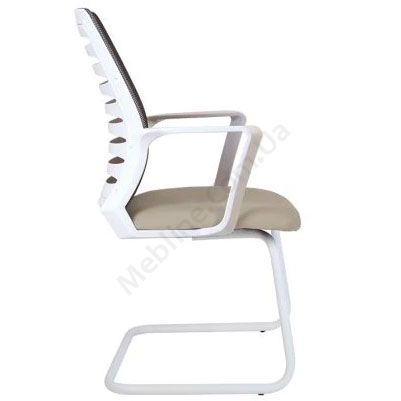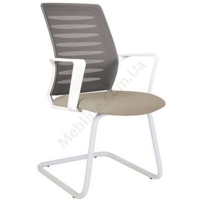 Офісний стілець з дихаючою спинкою, пластиковимибілими підлокітниками, на білих полоззях.