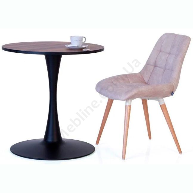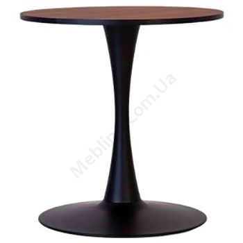 Круглий кухонний стіл зі стільницею з ДСП на металевій основі.