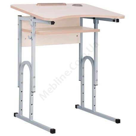 Стіл учнівський з регульованою висотою та похилою регульованою стільницею та підстаканником на алюмінієвій рамі.