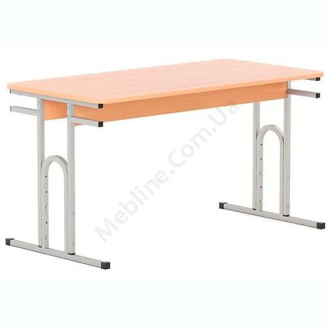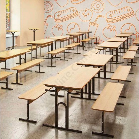 Тримісний стіл для їдальні з регулюванням висоти, закругленими кутами та підвісами для лавок на алюмінієвій рамі.