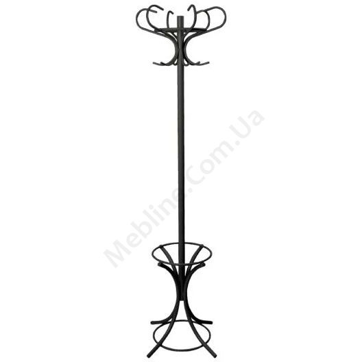 Оригінальний вішак-стійка з гачками, місцем для головних уборів та тримачем парасольок на чорній металевій рамі.