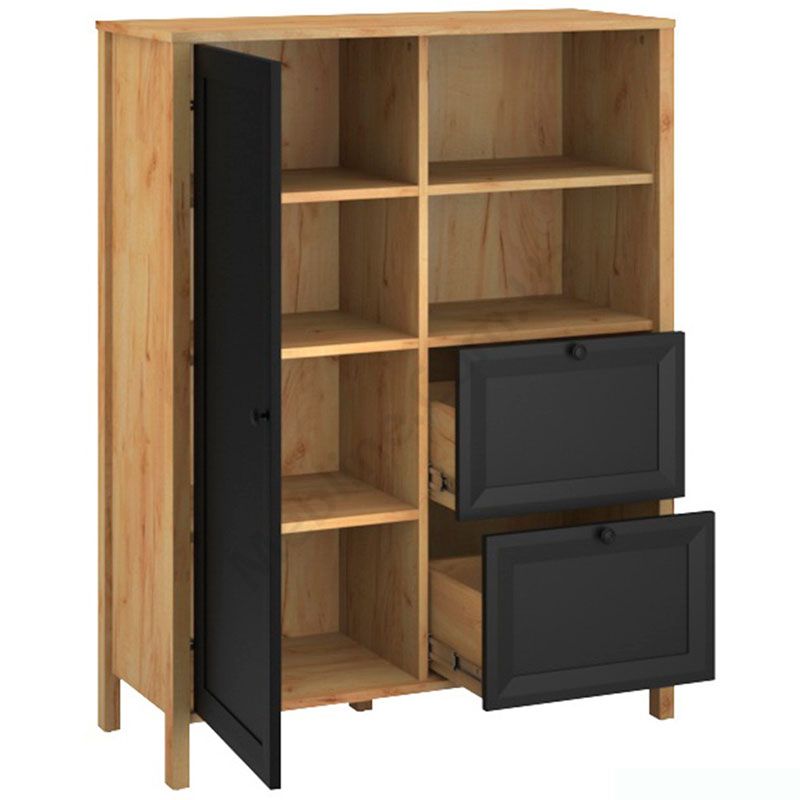 Комод на ніжках з відкритими секціями, дверцятами та шухлядами.