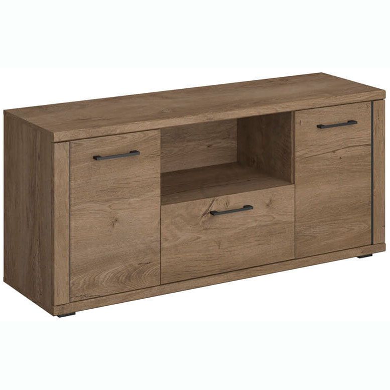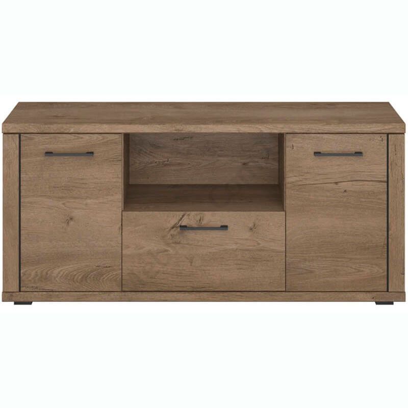 Тумба під телевізор з дверцятами, висувною шухлядою та відкритою полицею.