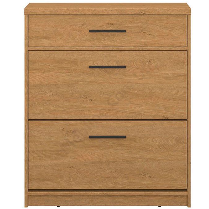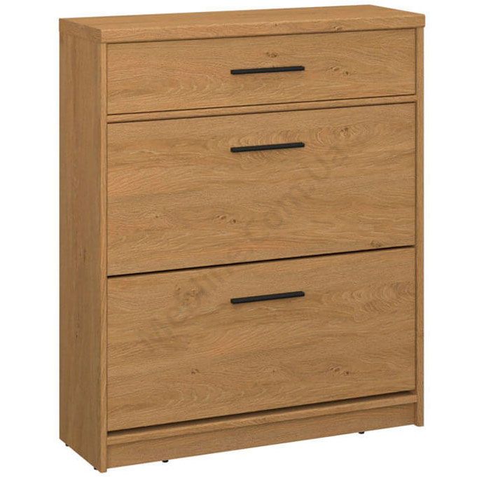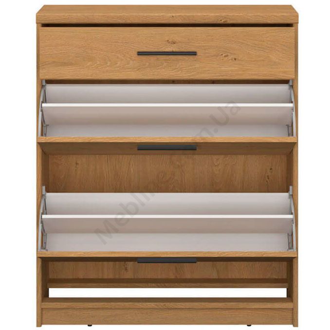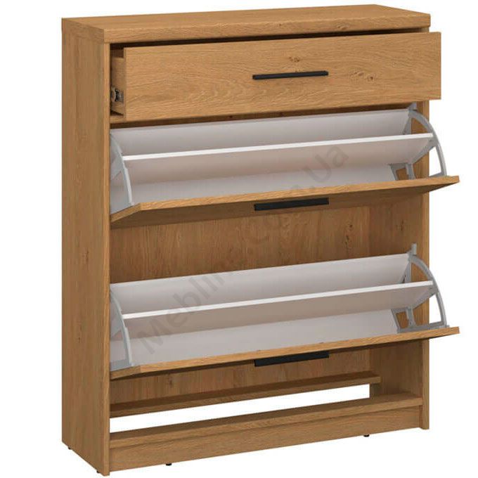 Тумба для взуття з двома відкидними дверцятами та висувною шухлядою.