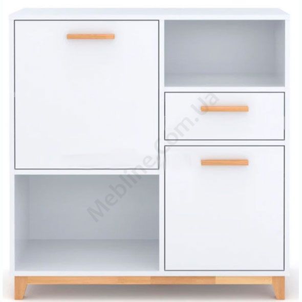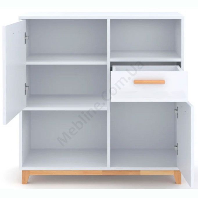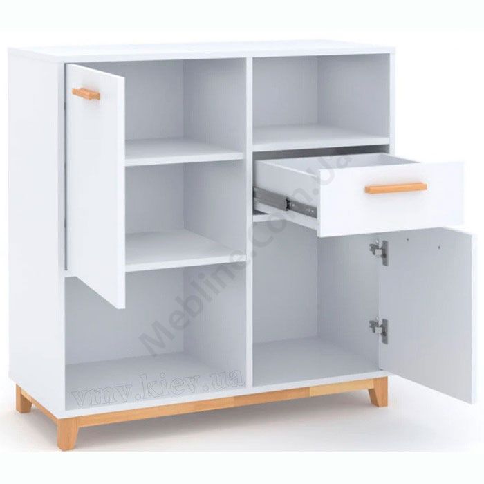 Комод на ніжках з висувними шухлядами, відкритими полицями та дверцятами.