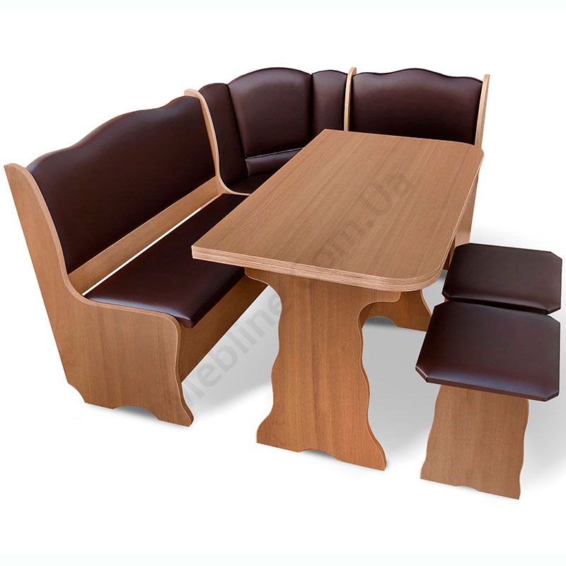 Кухонний комплект, що складається з розкладного столу, м’якого куточка та табуреток.