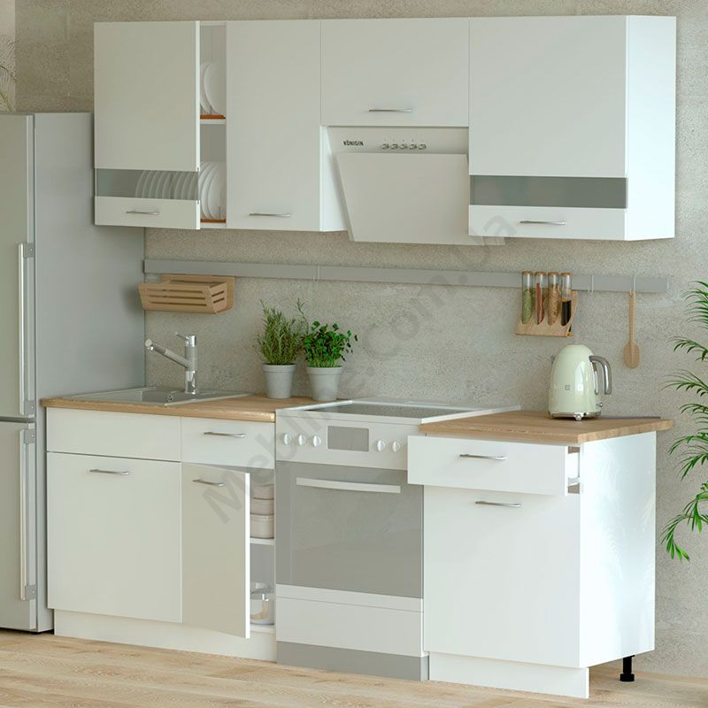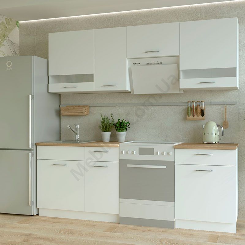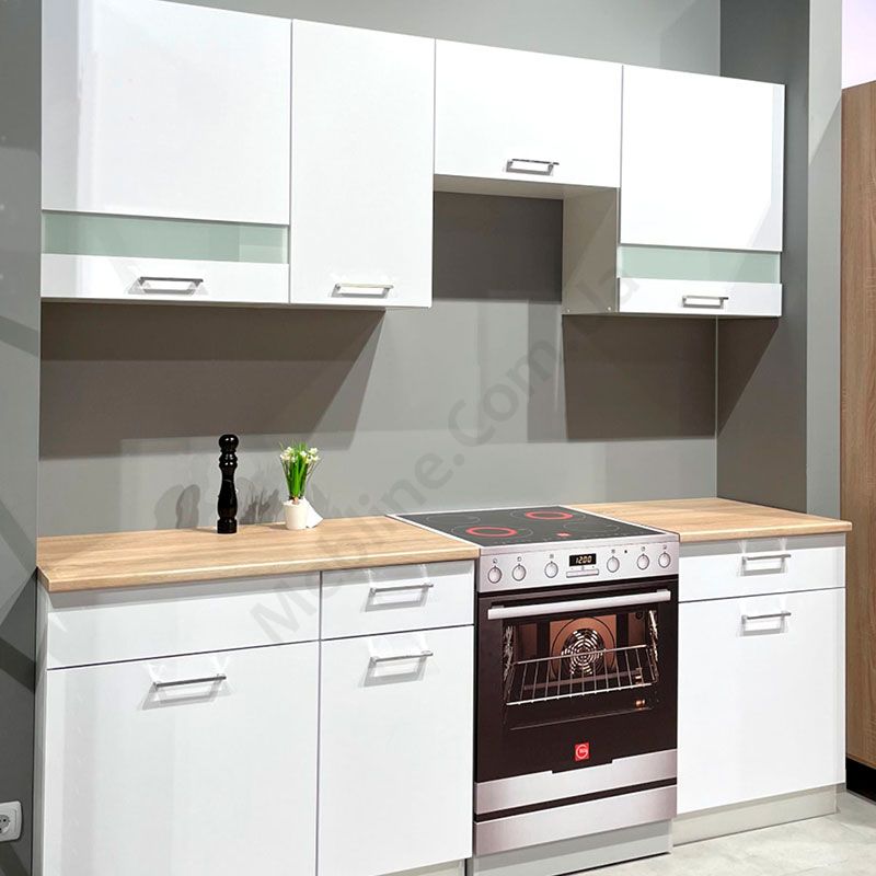 Готова кухня довжиною 220 см зі скляними вставками, стільницею, верхніми та нижніми модулями.
