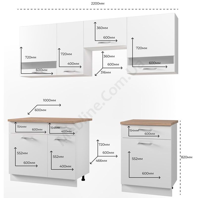 - За дверцятами по одній полиці, під мийкою — без полиць.