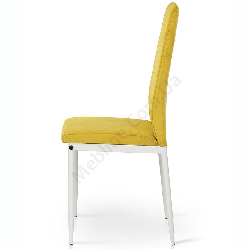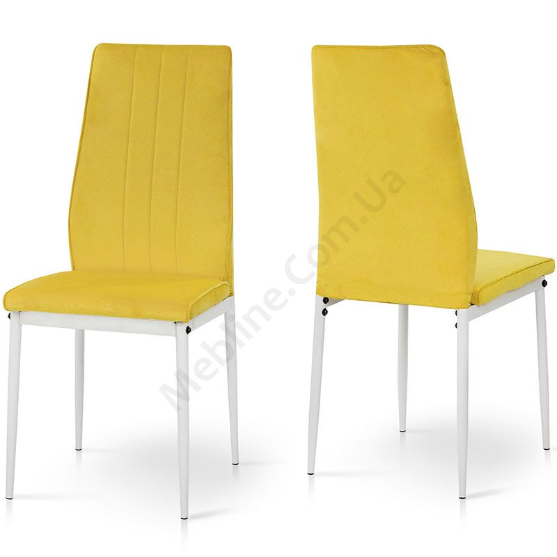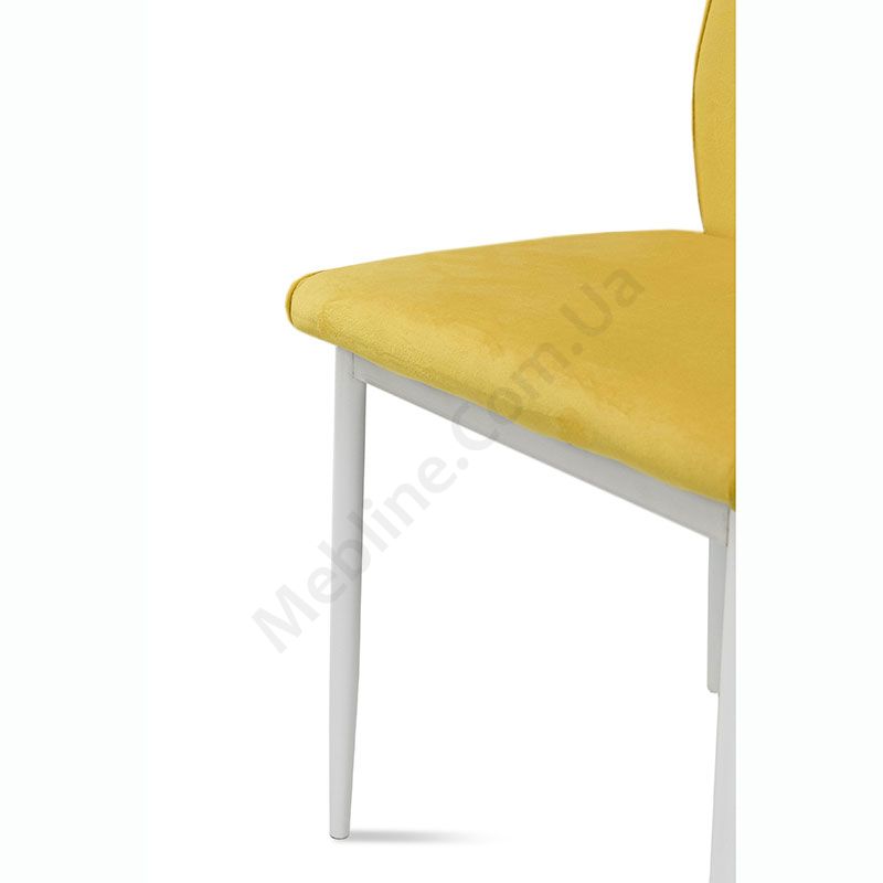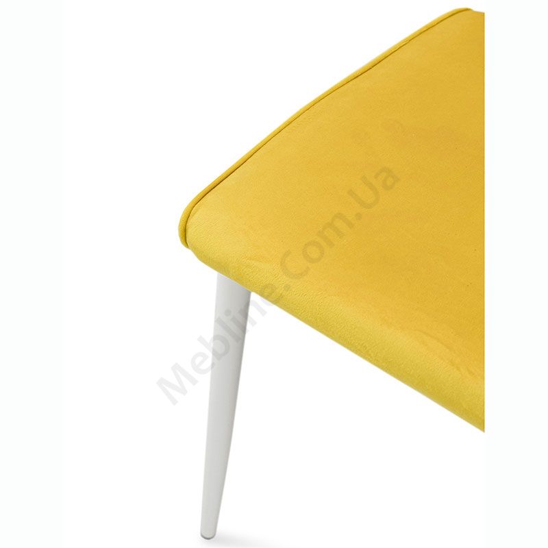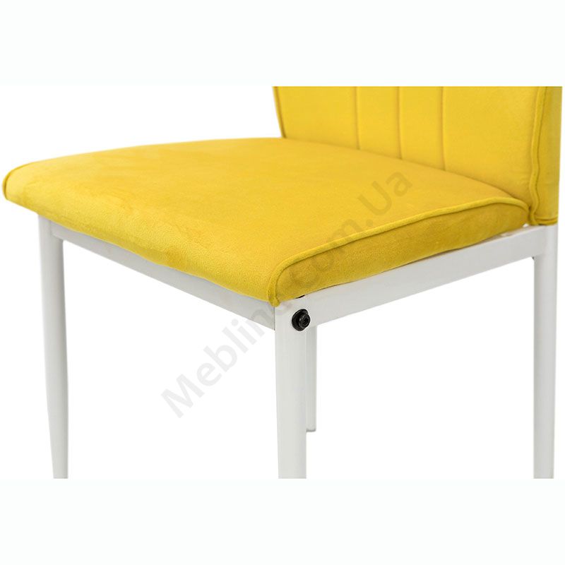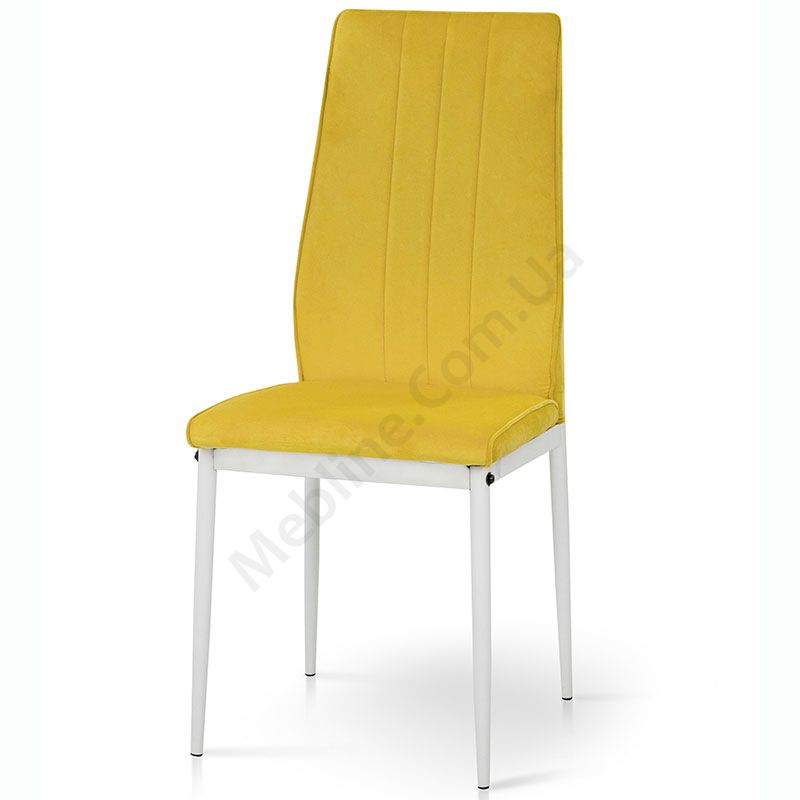М’який стілець без підлокітників на білих металевих ніжках з велюровою оббивкою жовтого кольору.