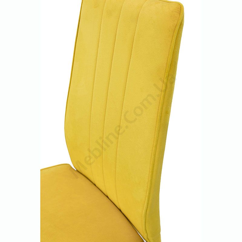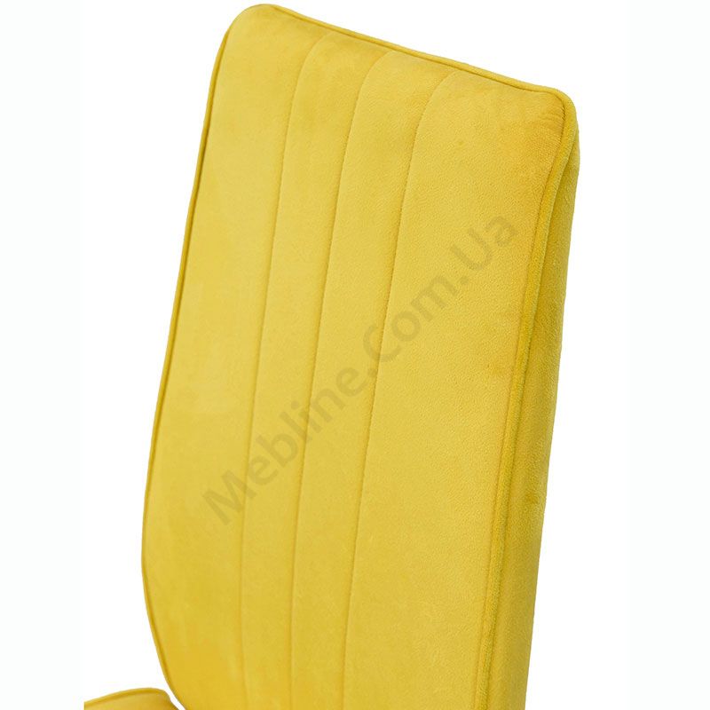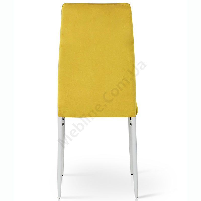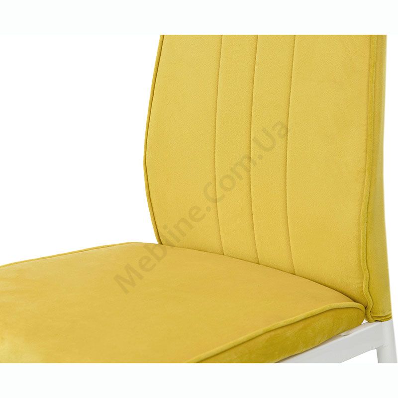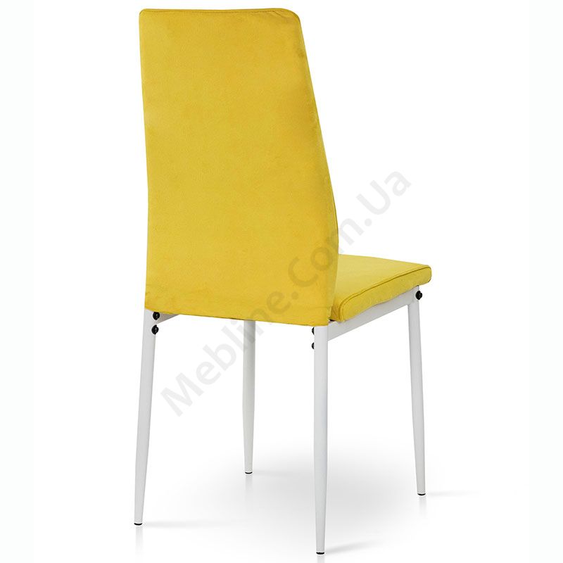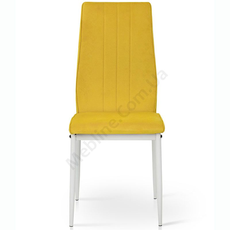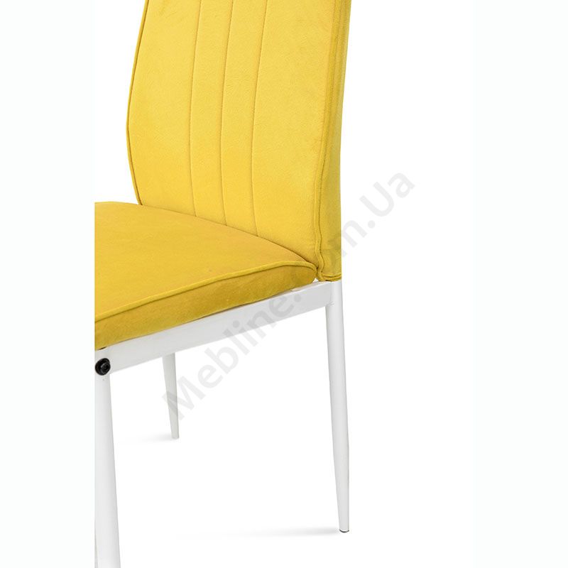 М’який стілець без підлокітників на білих металевих ніжках з велюровою оббивкою жовтого кольору.