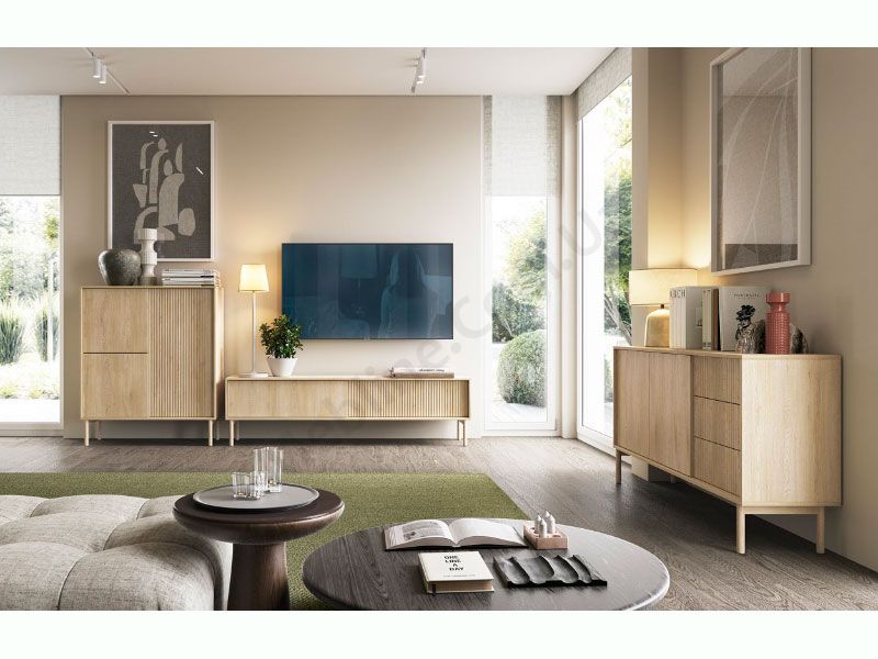 В асортимент колекції входять необхідні меблі для облаштування вітальні — комоди та тумби різних модифікацій.