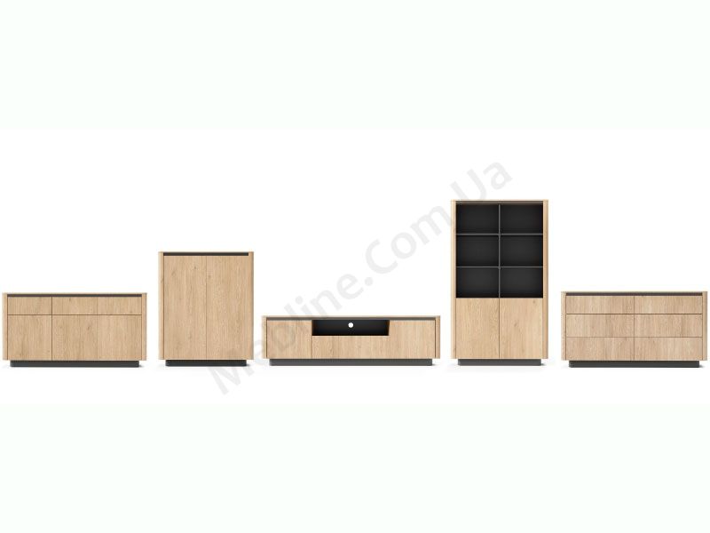 В асортимент колекції входять необхідні меблі для облаштування вітальні — комоди та тумби різних модифікацій та стелаж.