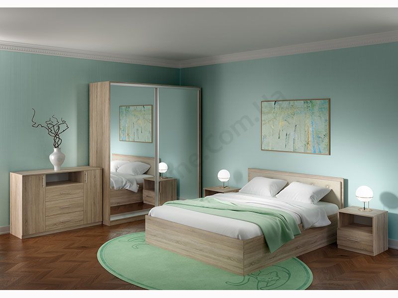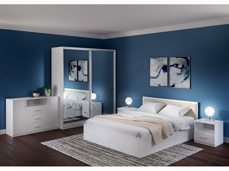 У колекцію входять необхідні для спальні елементи — шафа-купе, комод, тумба та двоспальні ліжка двох модифікацій. Додатково можна замовити ламельний вклад під матрас для ліжок.