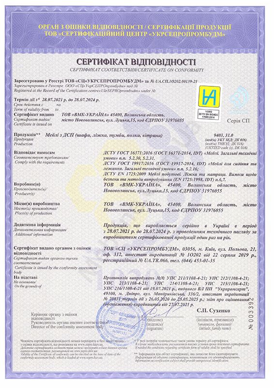 Матеріали, що використовуються при виробництві меблів - екологічно чисті та безпечні. Всі меблі ВМК Україна сертифіковані та відповідають вимогам усіх норм та стандартів.